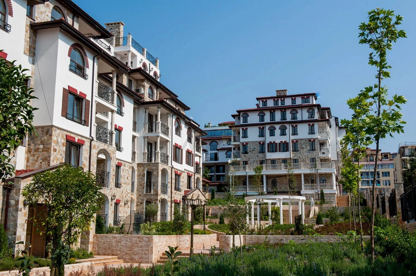 Апартамент с 2 спални в луксозен комплекс. Състои се от 2 спални, дневна с кухненски бокс, 2 бани, тераса.